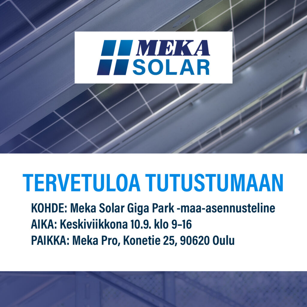 Tervetuloa tutustumaan uuteen aurinkopaneelien Meka Solar Giga Park -maa-asennustelineeseen keskiviikkona 10.9. klo 9-16 Oulun tehtaallemme osoitteeseen Konetie 25, 90620. Asiantuntijamme ovat paikalla kertomassa suurempien aurinkopuistojen telinetekniikasta ja sen mahdollisuuksista. Nähdään keskiviikkona!
